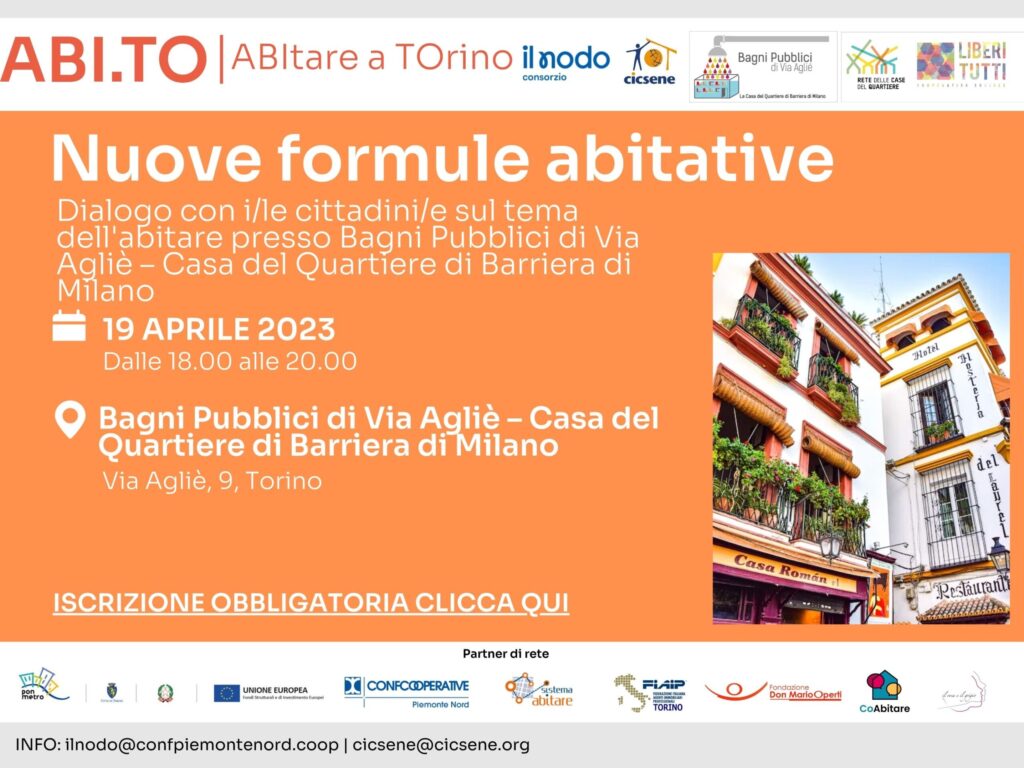 Prende avvio il 21 marzo il primo evento di animazione e dialogo con la cittadinanza, aperto a tutti/e, sui temi dell’abitare. L’incontro che si terrà in collaborazione, e presso, la Casa del Quartiere Bagni Pubblici di Via Agliè Torino e prevederà il confronto su “NUOVE FORMULE ABITATIVE”. Il progetto ABI.TO è inserito all’interno del Programma Operativo […]