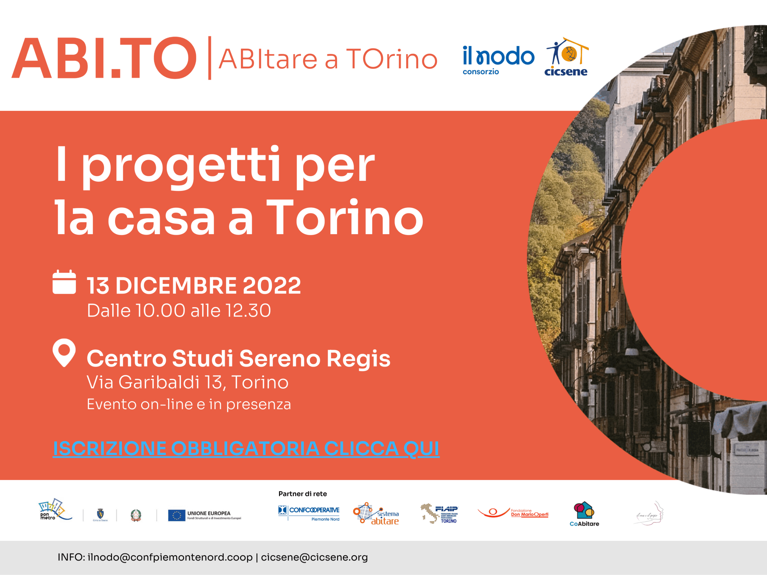 Il progetto ABI.TO è inserito all’interno del Programma Operativo Nazionale Città Metropolitane 2014-2020 (PON Metro), adottato dalla Commissione Europea, con l’obiettivo di creare maggiore inclusione sociale. Inoltre, è promosso e sostenuto da Comune di Torino e nasce dall’impegno del capofila Il NODO cscs, dal partner CICSENE e da una fitta rete di collaborazione territoriale composta da Confcooperative Piemonte Nord, FIAIP (Federazione Italiana Agenti Immobiliari Professionali), Associazione Il rosa e il grigio, Fondazione Operti, Sistema Abitare, COabitare.